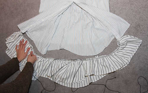 Jale el extremo no anudado de la cuerda, juntando al tejido por debajo de ella. Recoger la pieza de la colmena hasta que es básicamente la misma circunferencia como la parte inferior de su vestido.
