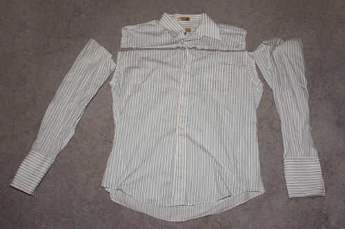 Corte camiseta #1 según el diagrama: las mangas de la camisa y recto en la parte superior justo debajo del botón del segunda. Esto servirá como el cuerpo de su vestido.