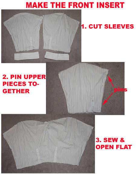 Para hacer la parte delantera insertar, primero corte las mangas como muestra - usted a cortar los puños de ambas y descartar. Prender las mangas juntas en el lado largo más cercano a la abertura de la abertura de la manga. Coser con un margen de costura de 3/8", abrir la pieza sólo coser y en posición plana.
