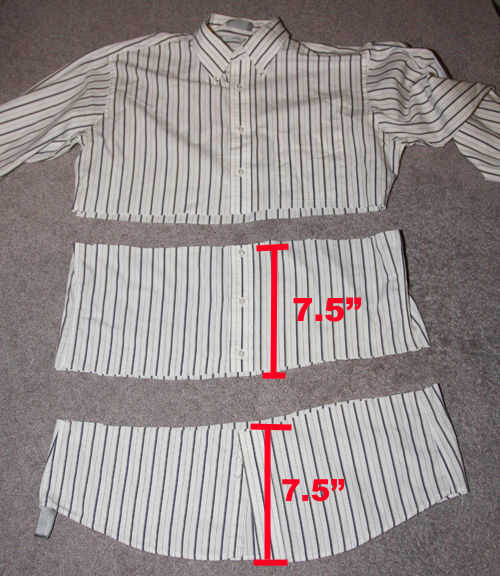 Botón para arriba camiseta #2 y en posición plana. Marca 7.5" encima de la parte inferior y 7.5" por encima de eso. Camiseta de corte recto, a través de ambas capas, en ambas marcas.