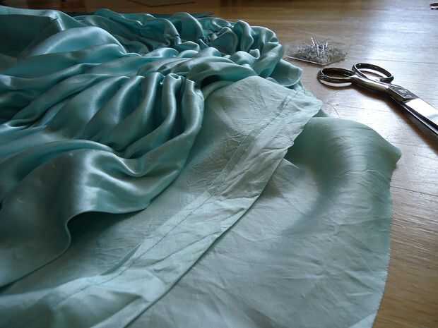 Marque el centro del delantero del revestimiento. Poner en una puntada corriente a lo largo del borde superior de la pieza de revestimiento. Pines hacia el exterior del revestimiento existente, empalmar hasta la cintura, entre la falda y el forro. Prender las costuras laterales a las costuras laterales y el frente de centro al frente del centro. La costura posterior debe abrirse para dar cabida a la cremallera, a continuación, pines para el revestimiento a lo largo de la cremallera a cada lado. Tire en los frunces y distribuirlos uniformemente en cada cuadrante. Fijando los cuatro puntos primero ayuda a mantener todo donde debe ser y no retorcidas.