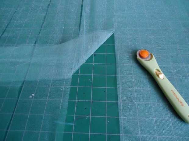 La capa de revestimiento interno será la parte superior de la pettiskirt. Corte las tiras de tul es super fácil con una cuchilla giratoria en una almohadilla de corte. Colóquela plana, doblada a la mitad y la plaza a las líneas. Yo simplemente enrolló fuera el perno ya que necesitaba. No necesitas ser quisquilloso con esto, simplemente cortarlo. Está bien si los bordes son saltones. Usé unos 4,25 yardas de tul 52". Seis tiras de 3.5 el "fruncidas concederá a una tira de 4.5". Seis de estas unidades fruncidas fueron alrededor de la circunferencia de la falda. Es un total de 36 tiras de 3.5" y 4.5" tiras de seis.