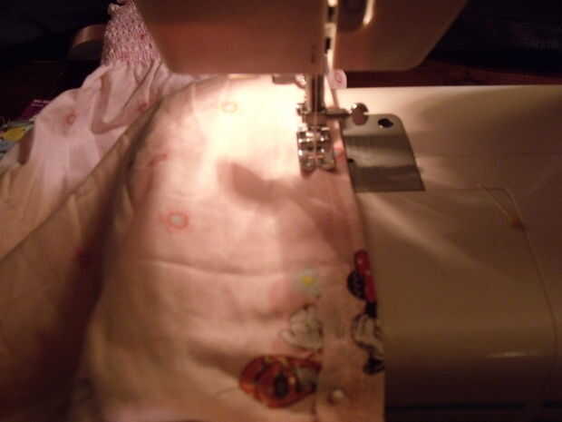 Ahora vas a prender a los lados y coser un dobladillo con la puntada de zig-zag. Después de dobladillar los lados, vas a prender esos juntos y luego coserlas juntas haciendo el vestido entero. Si usted decide que desea Presione la costura hacia abajo con un hierro, seguir adelante... no te dejo... jeje
