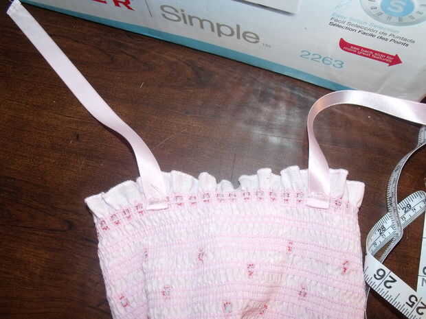 Con el vestido en su alambique hija, medir desde la parte delantera del vestido centrado en algún lugar cerca de los pezones de un lado, en la parte trasera justo a la izquierda de la columna (o derecho).5-1 "y poner un punto en que punto... que lugar es donde pones el botón. marca la longitud de la cinta es necesario, poner un punto de la cinta y que es donde el agujero del botón ir y luego realizar un pequeño dobladillo en la cinta para evitar que se deshilache. después de esto, vuelva la prenda y coser las tiras de cinta en la parte delantera.