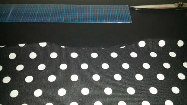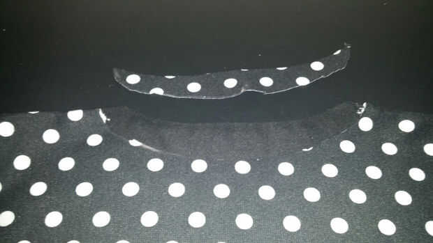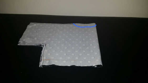 8. tiempo para cortar el escote. Doblar el cuerpo que acabamos de crear en la mitad. Medir hacia abajo 1/2 y cortar. Una vez que ha terminado corte resultan del lado derecho de la ropa. Ahora cortar el escote delantero abajo más profundo (tela de lunares). Doble modo y Mida hacia abajo de 1 pulgada.