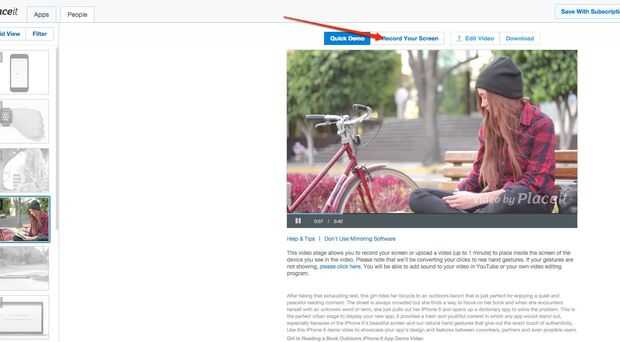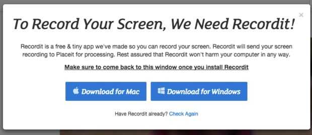 Haciendo clic en "Registro de su pantalla" podrás grabar tu app en Veekun Se le pedirá para descargar Recordit, la grabadora de pantalla gratuito que se utiliza para Placeit. Asegúrese de descargar la versión que necesitas.