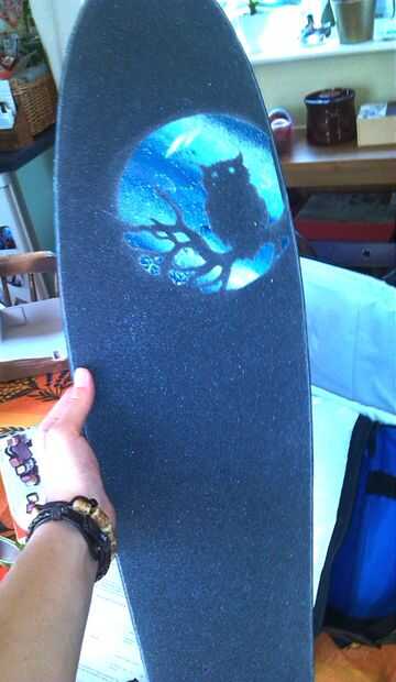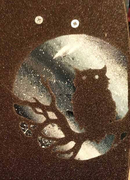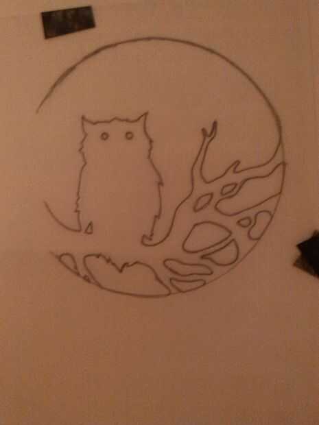 Quise cortar una silueta en la cinta del apretón de un buho para encajar con el tema luz de luna y había utilizado una imagen de internet como la inspiración para mi plantilla. Había simplificado para la Junta y recortar cuidadosamente con un cuchillo. Luego aplica a la Junta.