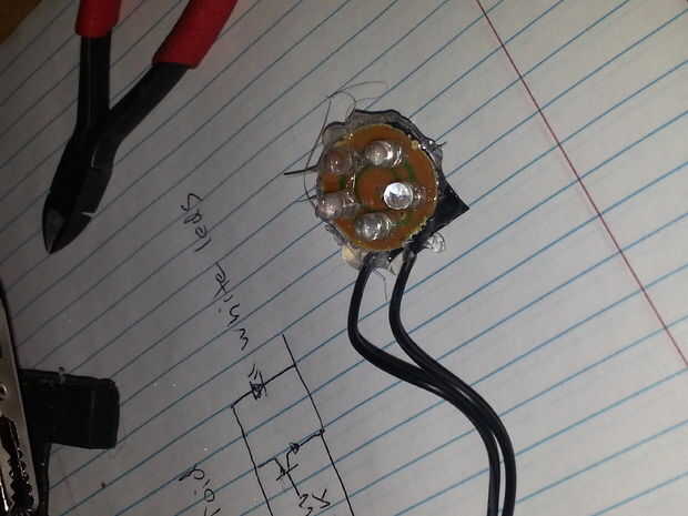 Primero el 1 ohmio de k a la media pierna (base) de la soldadura y soldadura el toroide. un cable a la resistencia y el otro irá al colector. Luego suelde los cables led del transistor. Desde que estoy usando 5 LED de una luz flash tuve que soldar los cables a la placa de circuito de los leds (círculo agradable PCB donde están montados los leds). Solde el cable positivo o plomo de los leds al colector del npn. Luego soldar el cable negativo o plomo de los leds para el emisor. Luego tomar un trozo de 5 pulgadas de alambre y soldar un extremo al emisor así. Esto nos ayudará a conectar la batería en el otro paso.