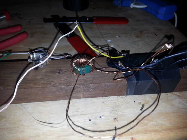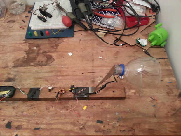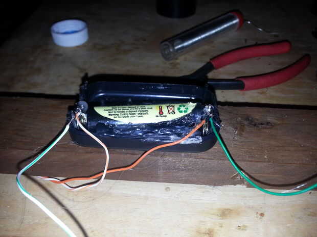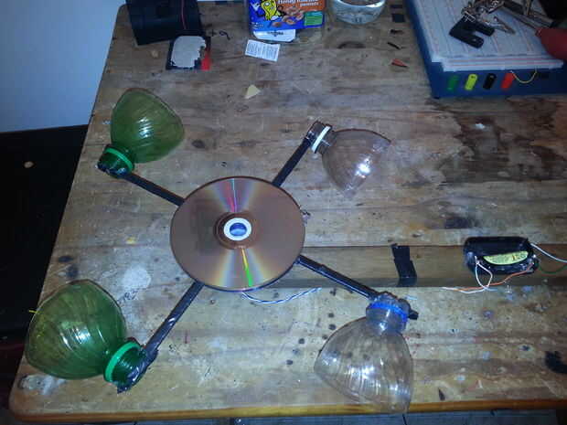 Ahora es el momento de ponerlo todo junto! Yo mío había montado en un pedazo de madera. Un extremo tiene el generador de viento, en el centro está la batería y en el otro extremo está la luz. Que caliente pega los leds en la parte superior de una botella de pop, este es un gran foco de luz improvisado. Se montaron el buld ligero en un tenedor doblado sacrificado. Estará poniendo esto en un trípode más adelante. Se puede montar en cualquier manera que usted quisiera! Te recomiendo que uses una caja de proyecto a todos los componentes de la casa :)