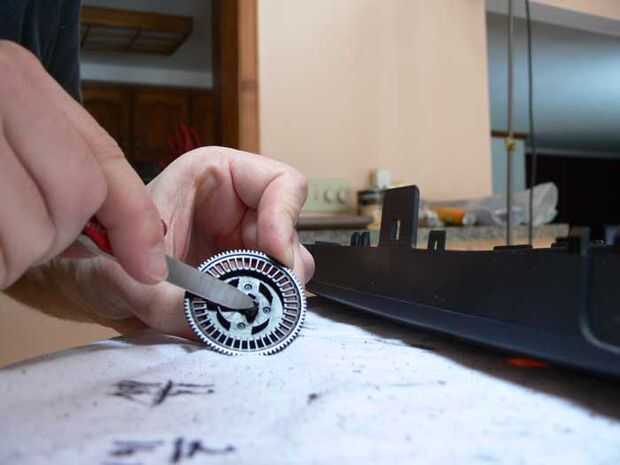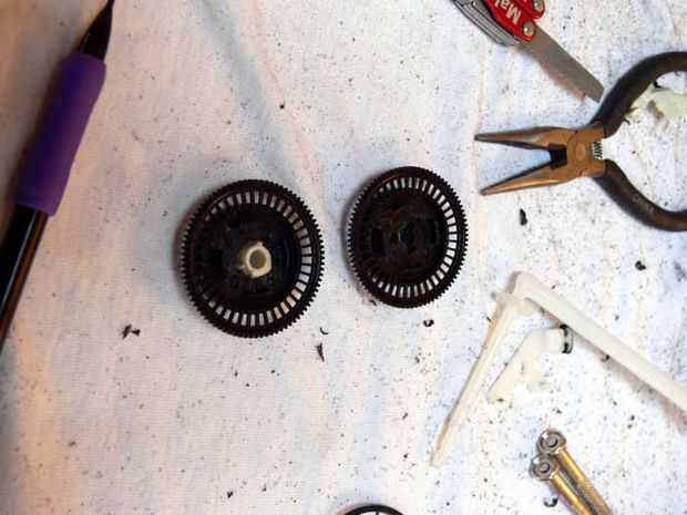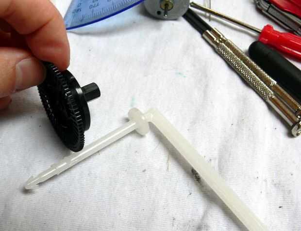 Es imperativo que el molinete grande engranaje girar libremente y con precisión. Tuve que taladrar un orificio en el engranaje principal del juego del VCR que he seleccionado para que se ajuste sobre el eje de la rueda. Después de probar el equipo, se tambalea hacia adelante y hacia atrás como se giro. Para remediar esto, extraje otra parte cilíndrica de plástico en la videocasetera que cabe firmemente dentro del engranaje principal de juego y en el eje de la rueda. Esto redujo el bamboleo del engranaje grande inmensamente. Después estaba seguro de que la adición de la nueva pieza era una buena idea, había reforzado con epoxy.