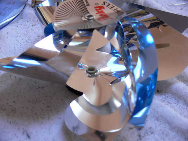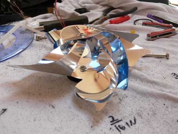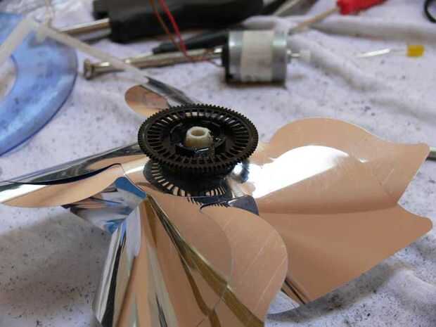 Ahora determinar la mejor manera de montar el engranaje principal sobre el ventilador del molinete. Tuve suerte porque el orificio en el engranaje principal era solamente levemente más grande entonces el ventilador. Había forzado el ventilador encima del engranaje principal y permanecía en la posición el tiempo suficiente para la prueba. Había reforzado el sello con resina hacia el final del proyecto después de que sabía que tenía la configuración correcta.