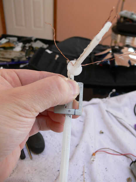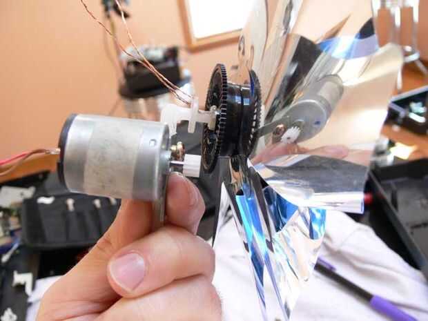 En ambos casos que he hecho un arbol de LED; Usé una lima o dremel para aplanar la parte del eje del molinete que montara el motor. Acoplar el eje asegura un montaje más apretado y facilita haga agujeros en el plástico para tornillos de fijación.