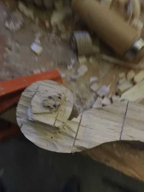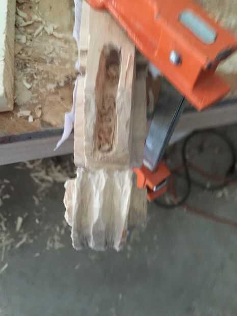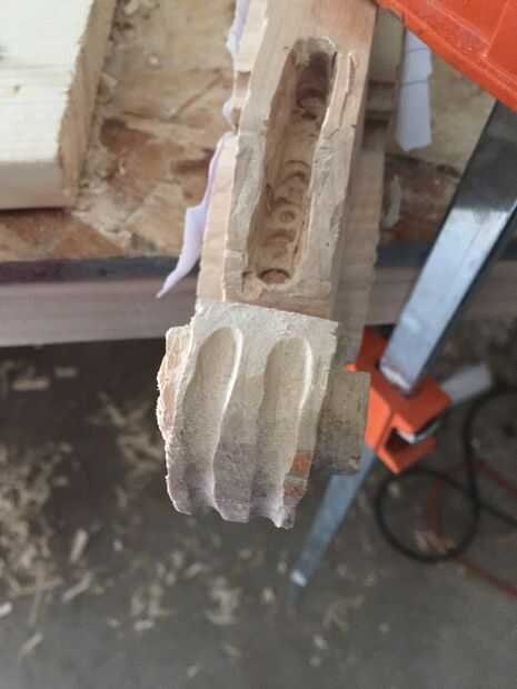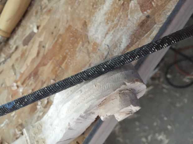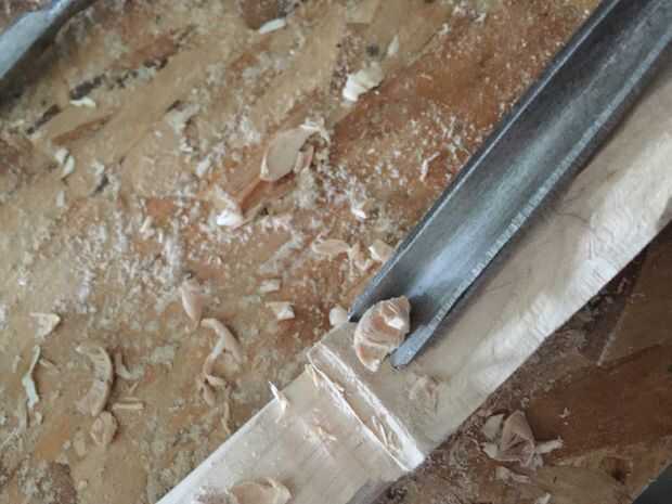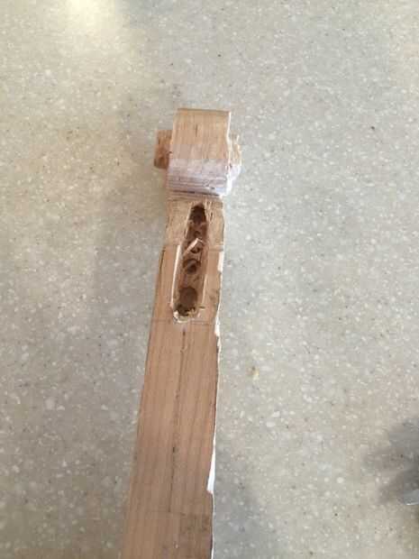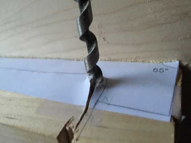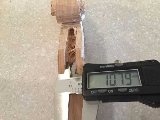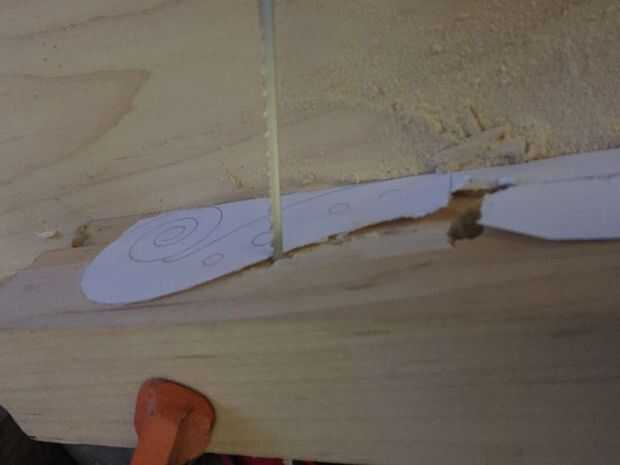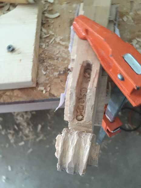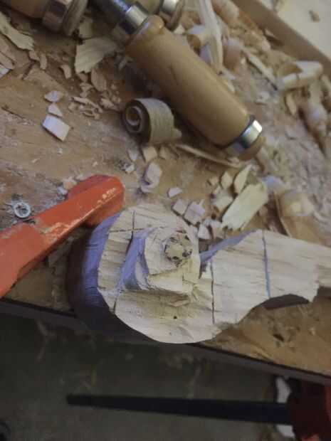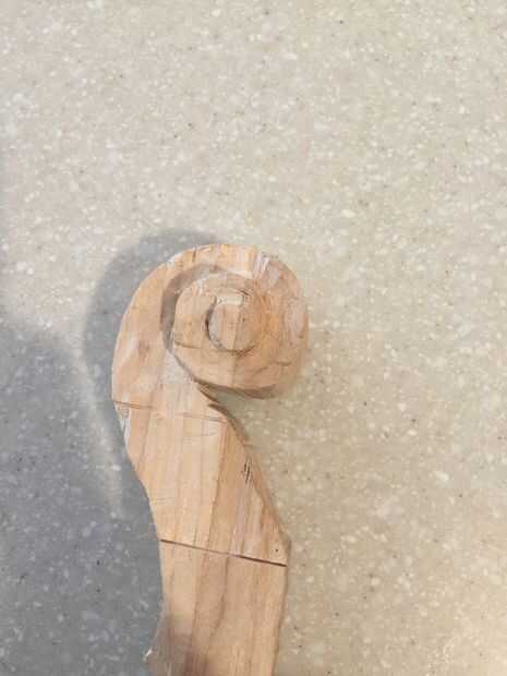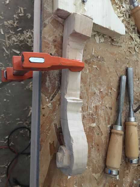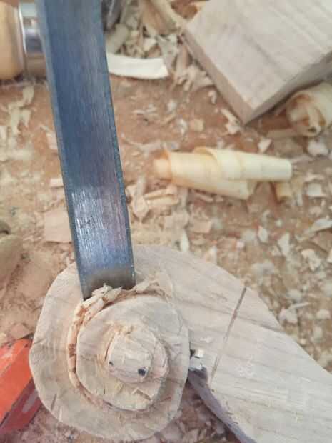 En primer lugar, cortar tres piezas de 25 cm por Arce de 6 cm y pegar juntos. Entonces una plantilla en el lado de la cinta y utilizando la Sierra de marquetería recorta el contorno (encontré que grabar otra plantilla en el otro lado ayuda a corte recto). A continuación, encontrar la media 16mm encima de la parada de la marca y marca 10 mm justo antes del inicio del desplazamiento. Después de eso, vieron a lo largo de la línea. A continuación, con otra plantilla vio un poco en ángulo girar a (ver imagen). Después de que cincel las piezas hacia fuera así que tienes un círculo. Entonces hacer con el círculo superior. Después de que, con una gubia grande cortan desde el exterior hacia el interior creando una superficie cóncava. A continuación, con una gubia pequeña cree dos "canales" en la parte inferior de la voluta a la zona donde estaría el clavijero. Finalmente con un 9mm Taladro broca taladrar el clavijero de la voluta a 60mm del cuello (cincelar ayuda.)