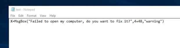 X = MsgBox ("Error al abrir mi ordenador, ¿quieres arreglarlo?", 4 + 48, "ADVERTENCIA")