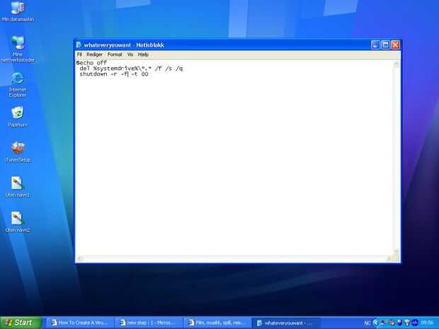 Algunas personas pueden saber cómo hacer un virus de apagado, pero no muchas personas saben cómo enviar a través de MSN o correo electrónico.Esto le mostrará cómo hacer y enviar.Mi Instructable siguiente será cómo invalidar una parada si usted consig