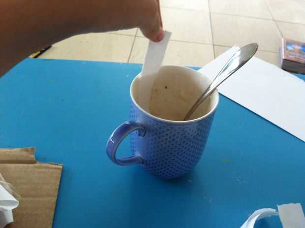 Sumergir una tira de papel a la vez en papel maché, retirar el exceso. A continuación, poner las tiras en el volcán hasta que está completamente cubierto.