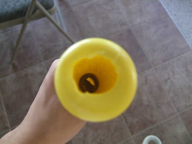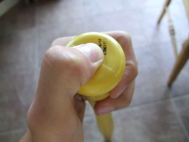 Toma su mano y coloque su pulgar en el extremo del mango del palo. Debe haber un pequeño agujero. Empuje hacia abajo hasta que las costuras se rompen un poco del agujero y hay un guión. No empuje demasiado o a deformar el plástico.