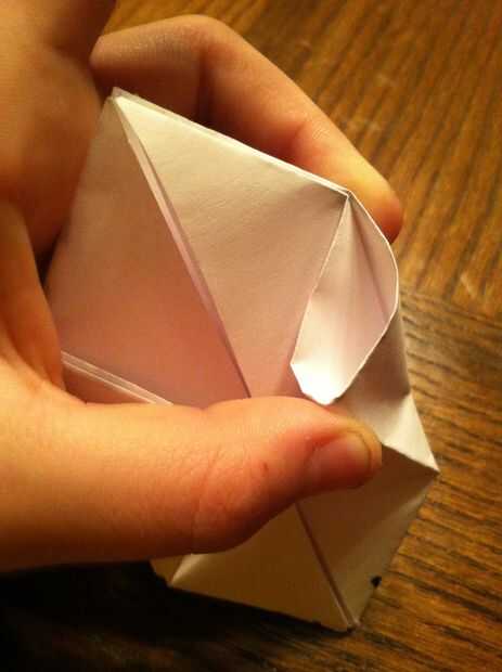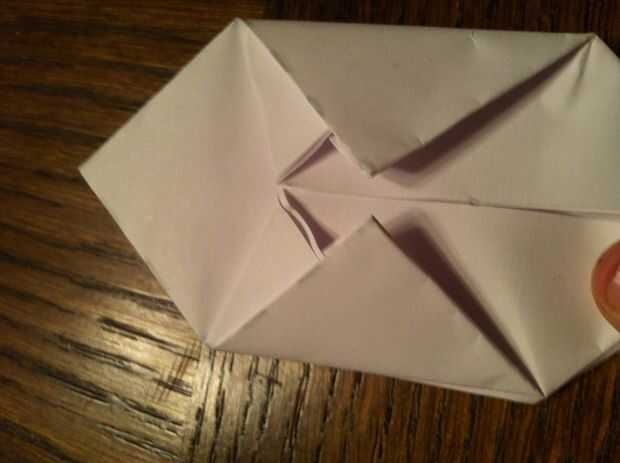 Si pellizcar el doblado sobre las aletas sólo le hizo ver una especie de bolsa, el extremo superior va ser bien escondido en esta bolsa para que no se mueva. Repita este proceso en los 4 lados.