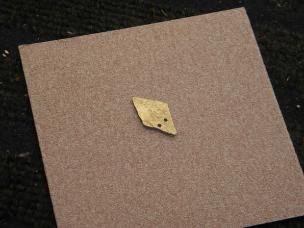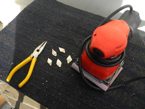 Con la lijadora, lije la superficie y lados de los fragmentos de gruesa a lija de grano fino para una mejor calidad en el acabado. Al lijar las superficies, la arena en otro pedazo de papel de lija. Para los lados, sostenga los fragmentos con unos alicates. Esto también le dará la oportunidad de ajustar la forma de los fragmentos. Use una máscara para evitar respirar las partículas.