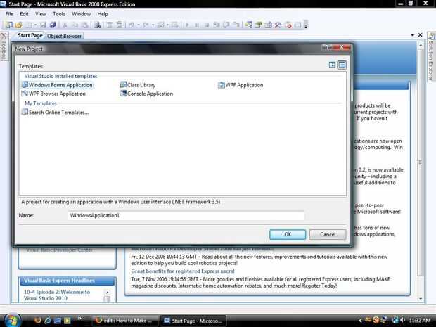 Im que va a enseñar cómo hacer un navegador web en Visual Basic 2005.Paso 1: a partir de Abierto Visual Basic y empezar una nueva aplicación de Windows.Paso 2: Agregar las herramientas de Añadir a:Cuadro de textoNavegador web5 botonesen ese orden.Pas