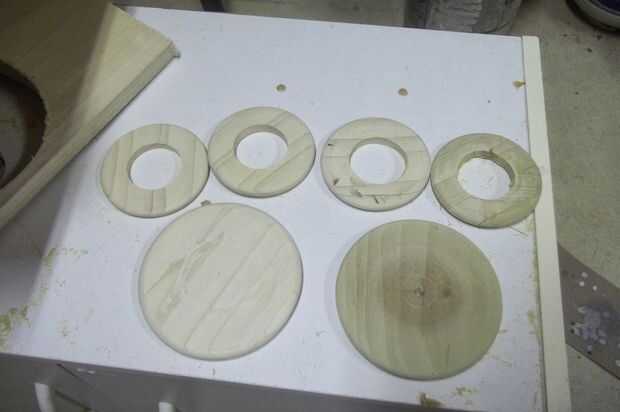 Luego, encendí algunos discos para las bandas elevadas los guardias de mango que están justo debajo de la rainguard y en la parte inferior de la llave. Taladré orificios de los discos más pequeños con la misma broca de paleta como arriba. Te esperaré hasta más tarde para pegar estos.