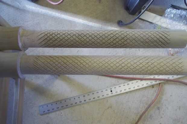 A continuación, utilicé mi herramienta espiral Sorby para añadir una textura de espiral va en cualquier dirección en el mango para conseguir un apretón de textura de diamante, también conocido como nudo de metalúrgicos.