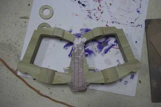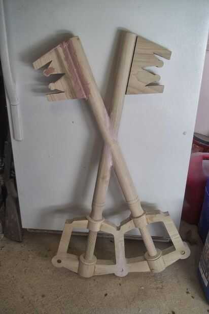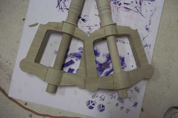 He puesto los discos y bastones contra los guardias de la manija donde debe ser y aplicaron bondo para llenar en la izquierda de la brecha de la corte y también se aplica a las muescas en los postes para alisar hacia fuera. Necesitaba esperar reunir bondo los polos hasta que la guardia fue fijada para que nada estaba mal alineada. El bondo es lijar luego y los detalles adicionales se agregan en la guardia como las líneas y los círculos ahuecados.