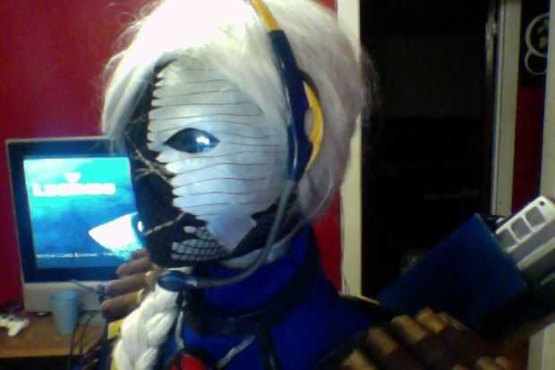 2. para el cabello, tenemos una larga peluca gris... Originalmente estuvimos pensando en tratar de trenzar la peluca como Katniss de los juegos del hambre, pero eso no funciona cuando realmente ponemos. apenas bajamos con él. Sólo usar una media o un casquillo de la peluca a previamente (que desafortunadamente no hicimos)