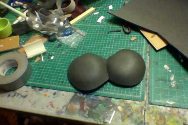 3. para las placas de pecho, cortar círculos y coge una escudilla que es relativamente el tamaño del busto de la persona. Mientras esté caliente, presione el disco de espuma en el recipiente después de que se ha calentado por la calefacción de la pistola. Manténgalo ahí como se refresca de la disco, que le permitirá mantener su forma. Una vez que tengas dos, pegarlos junto (Foto 2)