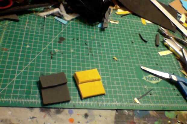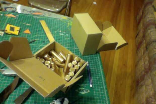 1. tenía algunas balas de plástico falsos poniendo alrededor así que tomó de ellos aparte y el aerosol pintado oro y les ensucian encima con pintura negra. Esto fue alrededor del bíceps derecho en el diseño. (foto 6)