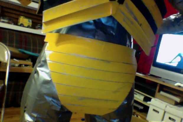 5. sugiero que pintar el cinturón en este punto. Asegúrese de que el color de la ropa interior coincide con el amarillo de los bolsillos. Necesita plastidip toda la espuma antes de pintar... Luego usar gesso para actuar como imprimación y luego pintar el amarillo. Usé un marcador plata para darle un aspecto más rayado. Cable está luchando constantemente... no preveo lo limpio.