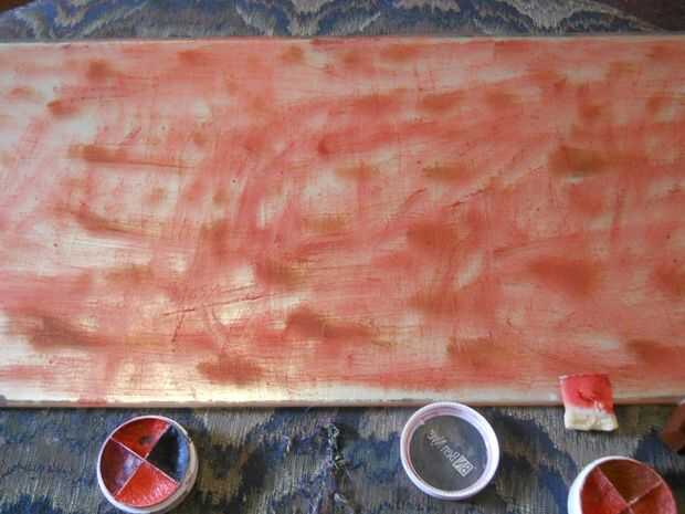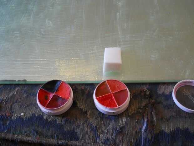 maquillaje de crema negra o ruedas y otra esponja de látex. Comenzar agregando capas de colores para el látex. Si usted está haciendo los intestinos sanos, utilizar rosas, rojos y marrones. Mezcla los colores con los dedos. Si usted está haciendo a zombie intestinos (necróticos), utilizar rojos, marrones y negros. Se mezclan bien con los dedos.