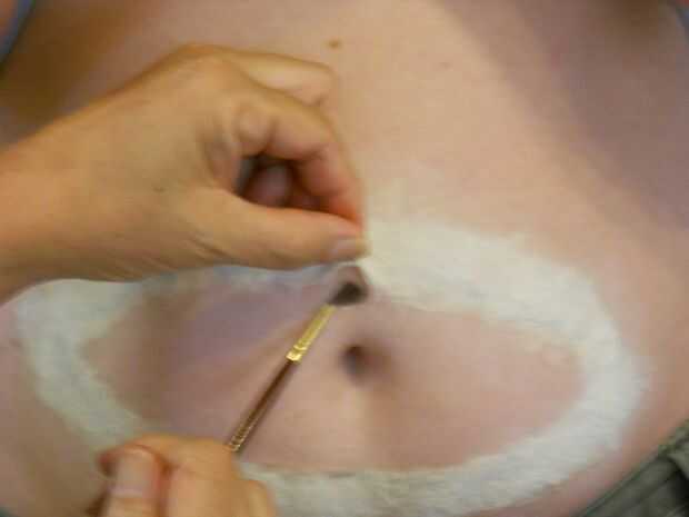 Cuando las capas están secos, tomar su polvo conjunto neutro y borla y recubrir las capas de látex, esto evitará que el látex que se pega a sí mismo. Asegúrese de que usted presione el polvo firmemente en el látex. Pelar con cuidado encima de un borde del látex y polvo el bajo con polvo conjunto neutro y un cepillo pequeño. Ello, a una profundidad de por lo menos 3/4" de pulgada.