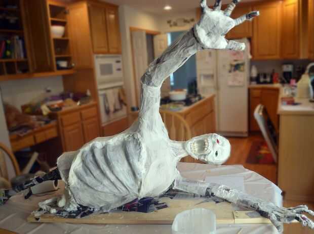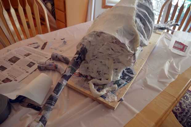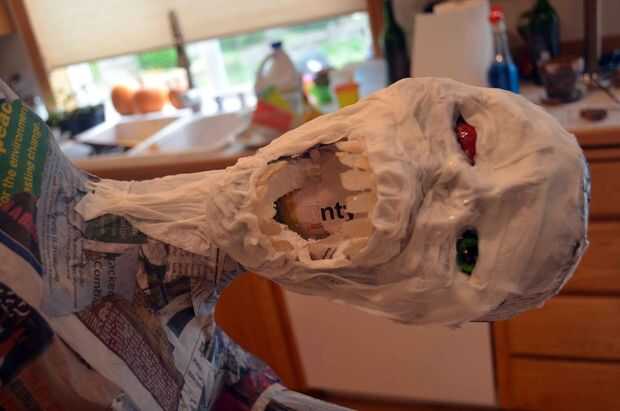 Cubrir la cosa entera con papel maché, unos 3 capas vale la pena. Asegúrese de dejarla secar entre cada capa. Añada papel toalla sobre la parte superior donde hay piel. Mojar el papel absorbente en una mezcla de pegamento (60% 40% de agua del pegamento blanco de Elmer) puede pellizcar la toalla de papel para hacer las mordeduras o las venas. Para más detalle use papel higiénico. Papel higiénico es ideal para la fabricación de tripas y marcas de mordedura parezca más realistas. Después lo dejas secar un par de días, la cosa entera de la pintura con la pintura al aire libre (elegir un color no deseado del color o error ya que son super baratos de la tienda). Esperar otro día para la pintura se seque.