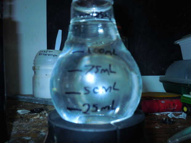 Ahora que ha limpiado el interior vas a querer hacer mediciones. Usando un envase previamente rotulado llene con agua hasta la cantidad que desea que sus medidas por. por ejemplo. permite decir quiero hacerla subir por 10mL, I medir 10mL y vierta en el bulbo y márquelo con un rotulador, luego lo haría otra vez hasta la parte superior (150mL). Si utilizas sharpie frotará después de un tiempo y usted tendrá que volver a marcarlo si desea medir con él, aunque no sé de ninguna otra cosa para usar.