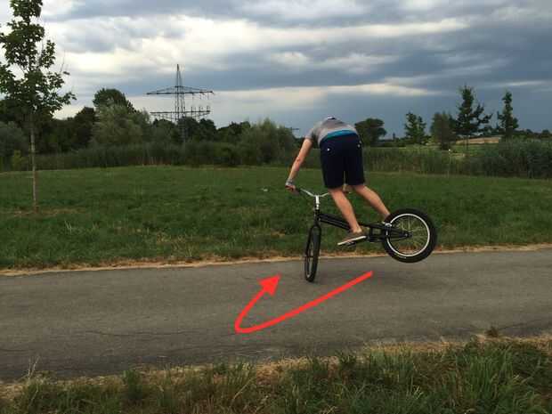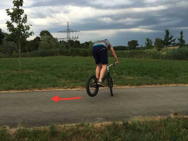 Espere el momento de inclinarse hacia adelante, esto es sobre un medio segundo después de que comenzó a frenar. Inclínese hacia adelante tanto como puedas (puede que necesite superar su auto), pero ten cuidado que no caigan sobre el manubrio. Mientras que usted empuja hacia adelante, seguir empujando la bici 180° desde el principio usando sus pies.