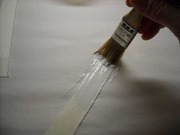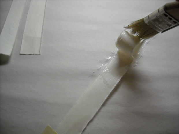 Pincel pegamento en la tira de la bisagra, cepillado en una dirección. Un movimiento de cepillado hacia adelante y hacia atrás a veces puede crear problemas. Ver imagen de abajo.
