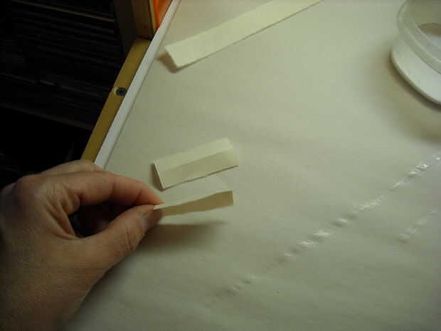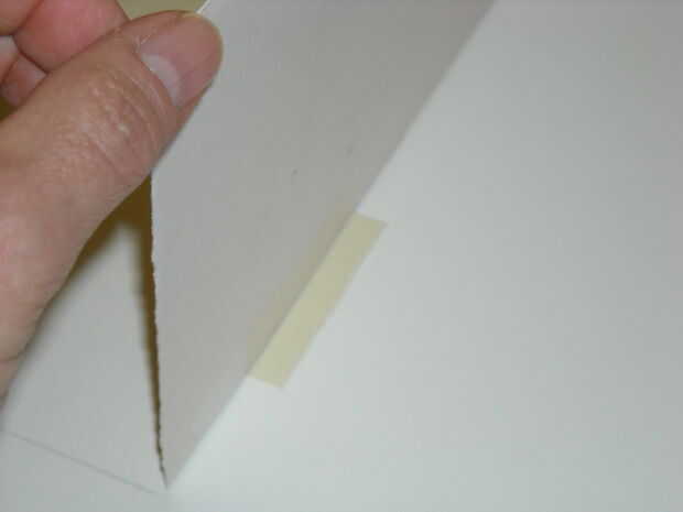Las bisagras son aproximadamente 2 pulgadas de largo y 1 pulgada de ancho. Doblarlas en la mitad del camino largo. Aplique el pegamento en la bisagra, luego aplique la bisagra a la parte posterior de la obra a lo largo del borde superior y luego Coloque suavemente el trabajo para el tablero del forro. Cerrar la ventana y si es necesario hacer algún ajuste menor en colocación antes el adhesivo se seque.