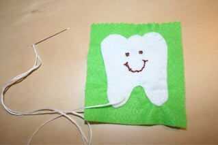 Usando hilo blanco bordado (o hilo) coser el fieltro diente a los 4" pieza cuadrada de fieltro.