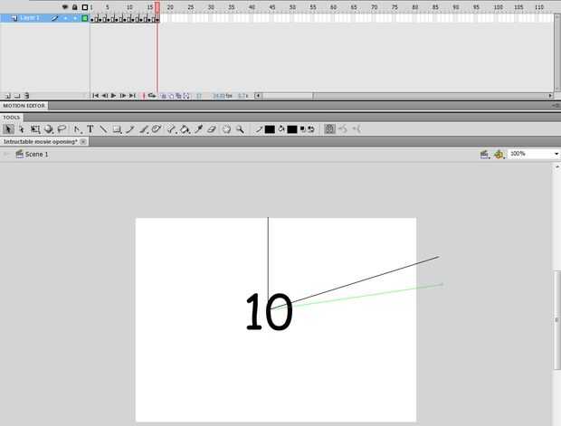 Después del hecho que una línea desde el centro de la pantalla hasta la parte superior de la pantalla. luego agregar hasta dos cuadros en la parte superior. Cree un fotograma clave, luego hacer otra línea que se inicia en el centro de la pantalla pero arrastrar el otro extremo de la misma al lado de la primera línea por lo que es un triángulo. Añadir la misma cantidad de cuadros como antes. Esta vez al agregar otro fotograma clave sólo tienes que arrastrar la segunda línea más a la derecha con la herramienta cursor negro Si parece que la segunda imagen repetir este proceso hasta que haya una rotación completa.