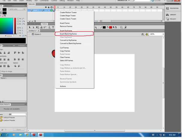 Para hacer otro fotograma, simplemente haga clic derecho sobre el rectángulo en la línea de tiempo junto a su primer fotograma. Haga clic en 'Insertar fotograma clave en blanco'.