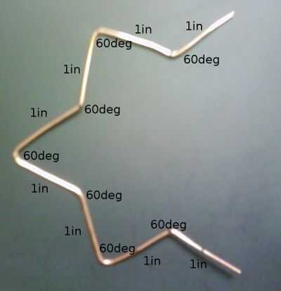 a repetir este paso para cada cable. Cada curva del cable será 60 grados exactamente como vamos a hacer triángulos equiláteros con este fractal. He utilizado dos pares de alicates y un transportador. Cada curva se hará en las marcas 1. Asegúrese de que se visualice la dirección de cada curva antes de lo que es! Utilice el diagrama de abajo.
