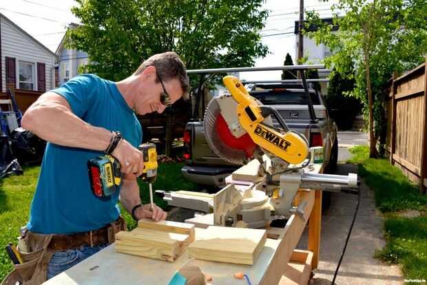 Mark comienza a construir la base de la antorcha. La base es básicamente una caja de madera con una hendidura en el centro, como una funda de madera, por lo que los rieles se deslizan dentro de la ranura y ser apoyados verticalmente.