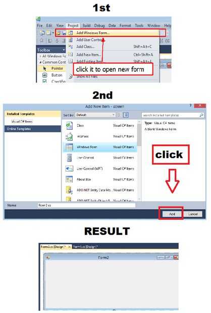 Ahora agregar nuevo formulario windows Forms haciendo clic en el botón de "proyecto" en la parte superior! y luego seleccione