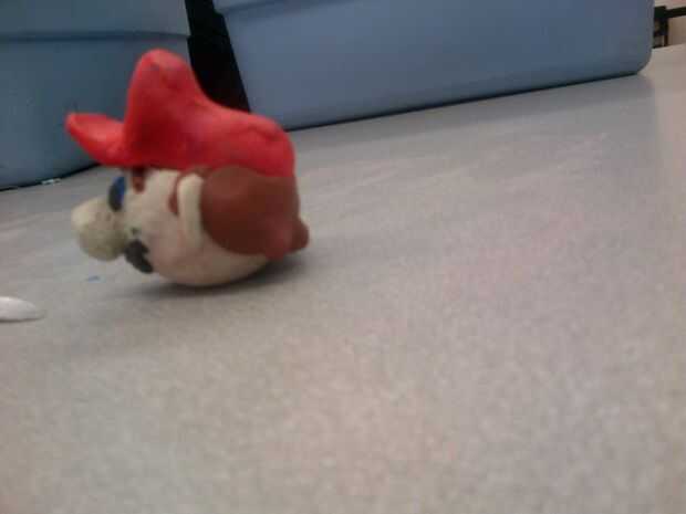 6: ahora toman el pelo que acaba de hacer y lo pegan en la parte posterior de su cabeza debajo de su sombrero asegurándose de que los golpes hizo en la arcilla en la parte inferior luego toman las 2 piezas pequeñas de arcilla y pegan a la cabeza alrededor de la oreja lo que parecen sus patillas.