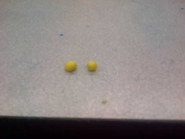 2: ahora toma dos pedacitos amarillo de arcilla y rodarlos en bolitas