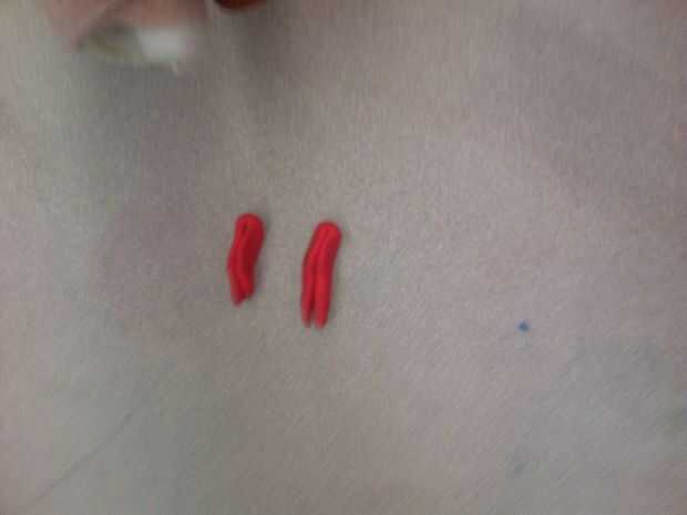 1: para los brazos que necesita dos piezas de arcilla roja del mismo tamaño hacerlas rodar hacia fuera así que un poco largo luego aplicarlas a los muñones que ya existen como en la imagen 1 y 2