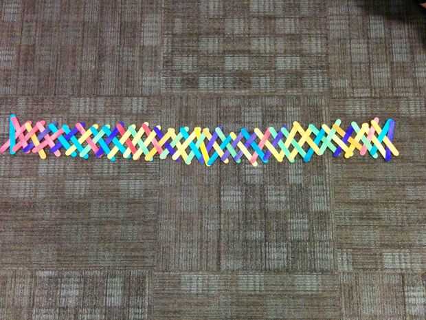 Continúe con los pasos 3 y 4 hasta que te quedas sin palitos. En este caso, pondría una pega en el palo azul y sobre el palillo rojo. Luego le pones un palo de otro en el palo amarillo y palo que solo pones abajo, etc.. Tratar de mantener el tejido tan amplio como sea posible.