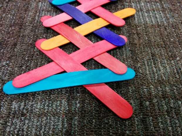 Para finalizar la cadena, ponga el extremo abierto de memoria final bajo el extremo abierto restante del palillo previamente establecido. (En el nuestro nos teje nuestro palo final, una azul, a través de los tres palos pasados de nuestra cadena.)