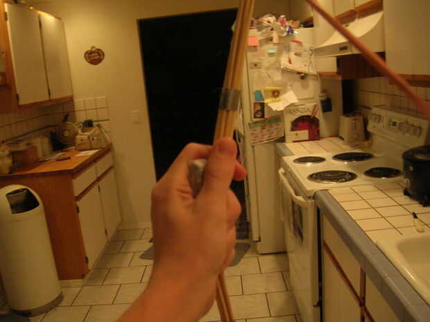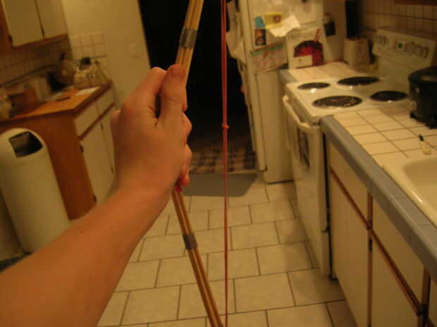 Ahora que terminaste! Ahora, usted necesita saber la forma correcta de sostener el arco. Mantenga como usted haría un arco normal, pero hacia los lados. Si usted está sosteniendo con su mano izquierda, tienen la curva del arco a la derecha. Si usted está sosteniendo con su mano derecha, curva hacia la izquierda. Mira la imagen si esto no es totalmente claro. Después, sólo un hornet en el medio, tire hacia atrás y fuego! Experimentar un poco con él, para ver cómo funciona y cómo lanzar correctamente el hornet. Es como disparar un arco, pero un poco más difícil. El arco tiende a agitar un poco con un agarre suelto, así que lo agarre resistente. Seguir practicando!